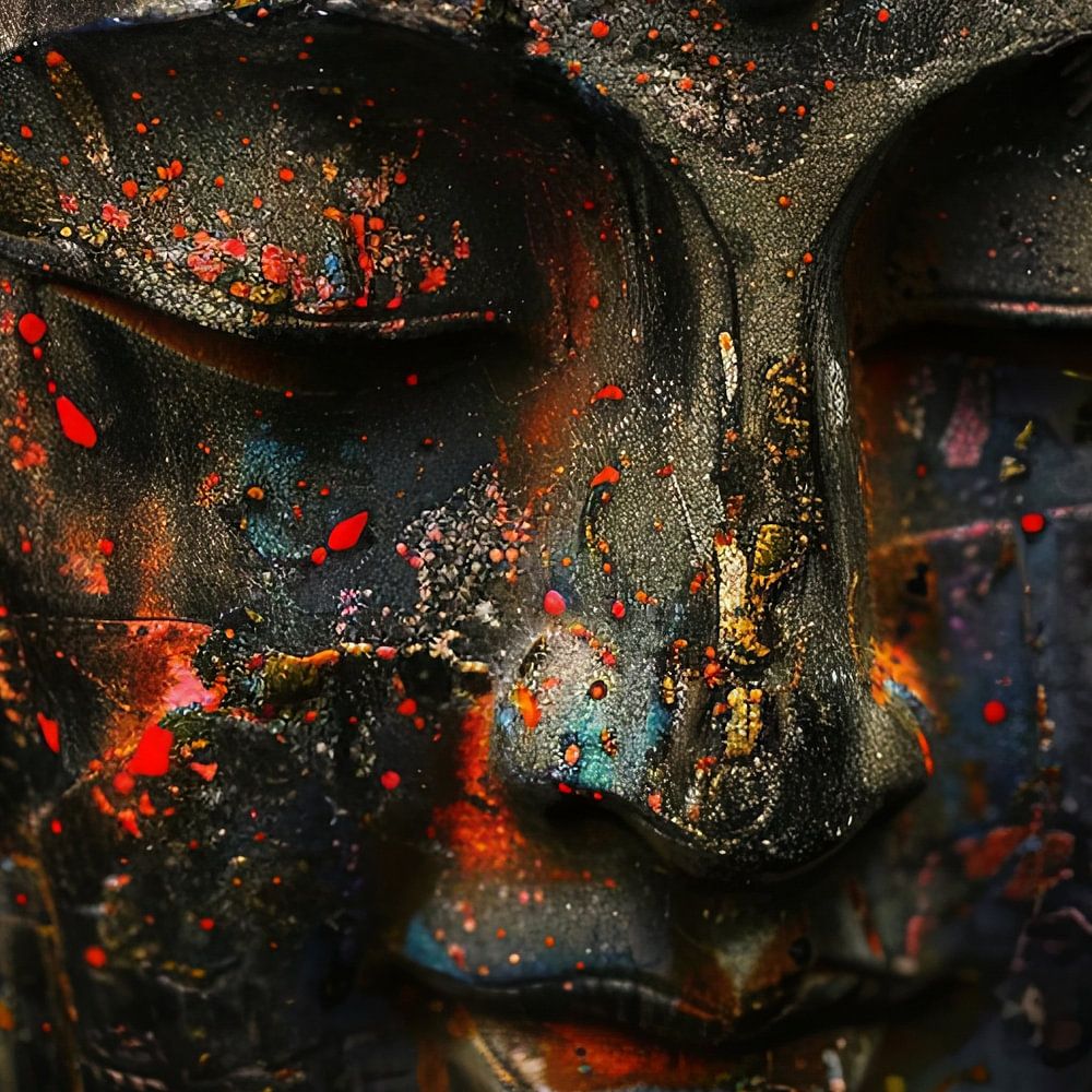 Immerse yourself in the colourful world of spiritual art with this fascinating Buddha statue. Vibrant shades of orange and blue splash dynamically onto the statue's peaceful surface, symbolising the flow of energy and enlightenment. Ideal for art lovers looking to add a touch of vibrancy and deeper meaning to their collection. Perfect for modern spaces that want to combine spiritual and visual impressions.