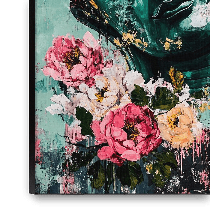Bring a touch of calm and colour to your interior with this beautiful painting of a Buddha head surrounded by vibrant flowers. The Buddha's serene expression and playful mix of green and pink tones create a harmonious whole that is both relaxing and inspiring. This artwork is perfect for creating a tranquil atmosphere in any room, from…