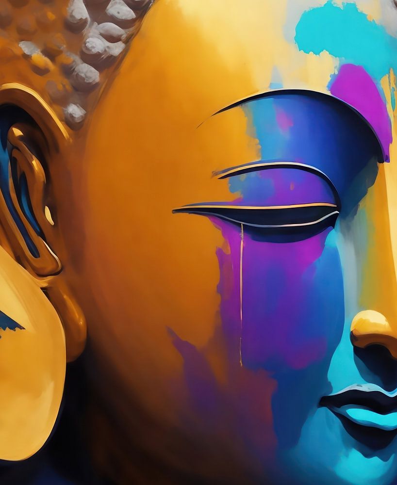 Buddha in abstract watercolour image a portrait in purple and yellow tones with blue an orange .