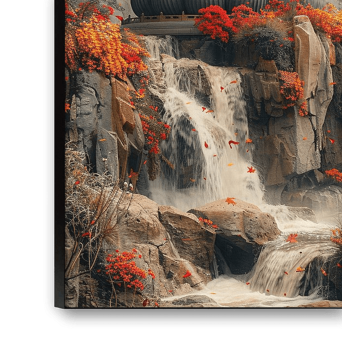 This artistic rendition of Buddha, set against a background of a vibrant waterfall and vibrant autumn leaves, embodies a serene composition that exudes peace and tranquillity. The orange and red tones of the leaves contrast beautifully with the stone tones of the statue, giving this design not only a spiritual depth, but also a visual one that charms and invites reflection. Perfect for a quiet room in the home or office, this design connects the viewer to natural beauty and the quiet power of meditation.