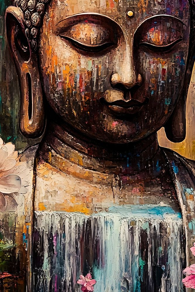 This beautiful design brings a serene and spiritual atmosphere to any room. At its centre is a detailed Buddha surrounded by colourful flowers and a gentle waterfall, exuding tranquillity and vibrancy. The colourful and expressive details make the painting an eye-catcher, perfect for creating a warm, meditative atmosphere. Ideal for bedrooms, offices or meditation rooms.