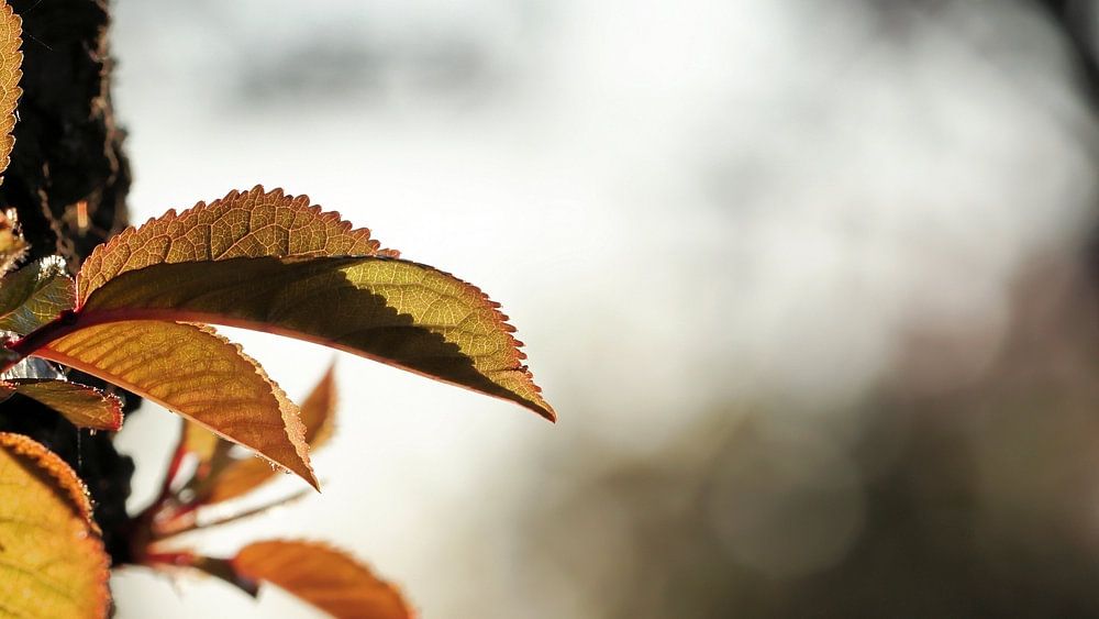 Close-up with backlight by the suns, of freshly sprouted leaves of a cherry tree on the first warm days of spring.