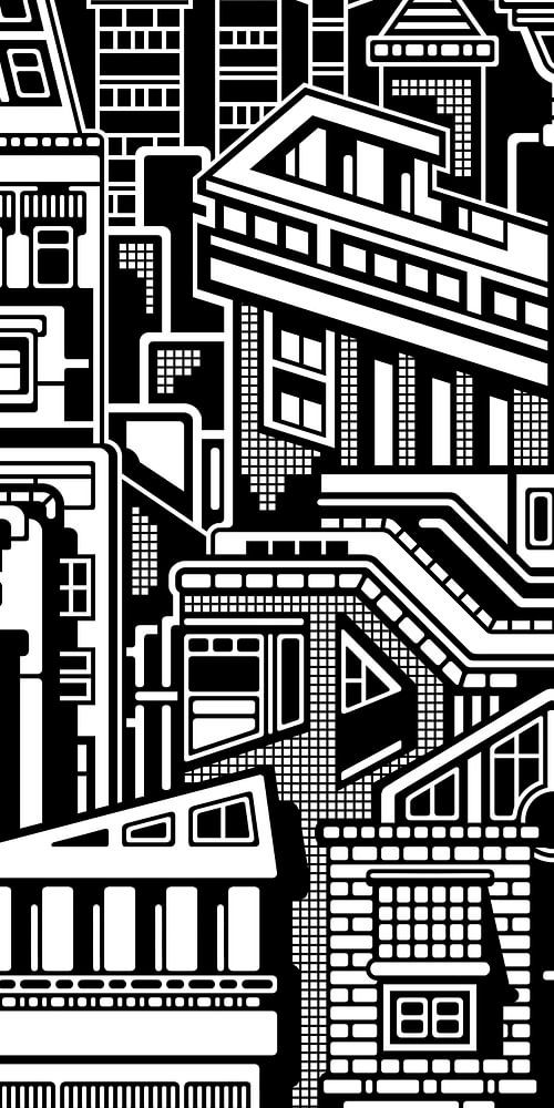 Black and white fantasy illustration of a futuristic city with many high-rise buildings at night by a full moon with a clear starry sky. Between the buildings/flats is a wide variety of building styles.