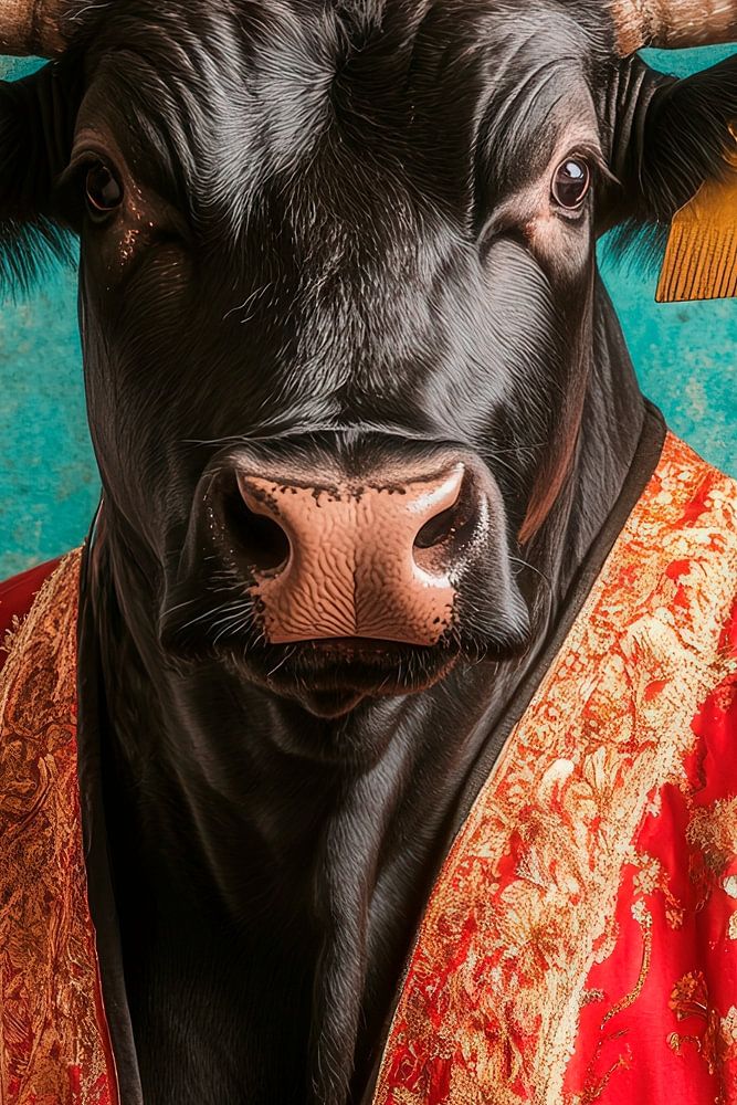 A majestic bull in splendid garb radiates a surprising combination of dignity and humour. The bright colours and impressive background immediately catch the eye. Ideal for the living room, where it acts as a conversation starter and eye-catcher to liven up the atmosphere and create an unforgettable ambience.