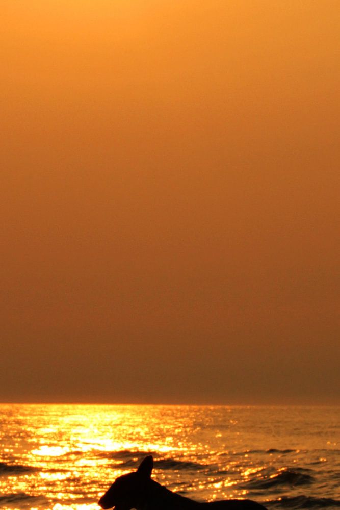 Bulterriër maakt avondwandeling over het strand bij ondergaande zon