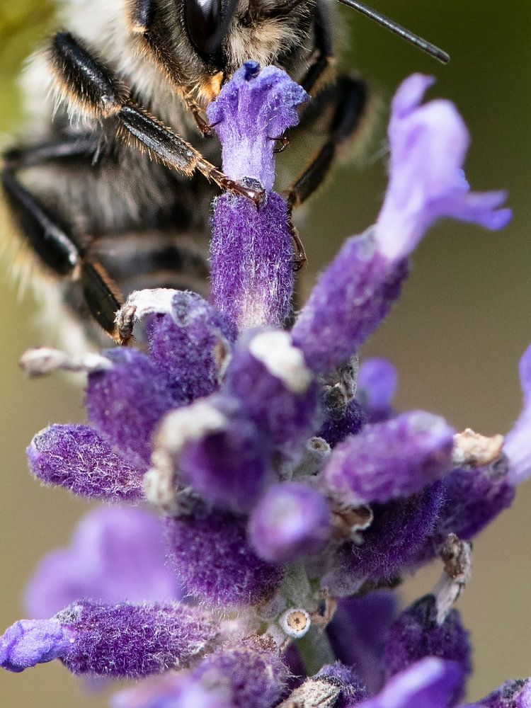 A bumblebee is looking for nectar on a flowering lavender bush. This bumblebee has a white color because it is discolored by the sun.