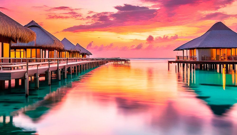 About "Bungalows in the sea with sunset"