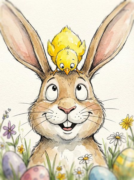 A cheerful bunny smiles with a tiny chick perched atop its head.