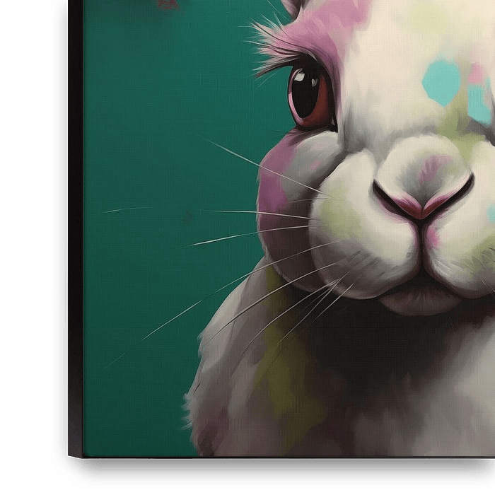 This art print portrays a close-up of a rabbit with an artistic and vibrant aesthetic. The rabbit's large, expressive ears and round eyes draw immediate attention. The background is a solid teal, creating a striking contrast with the rabbit's warm, pastel tones. The overall style is painterly, giving it a whimsical and modern look. The…