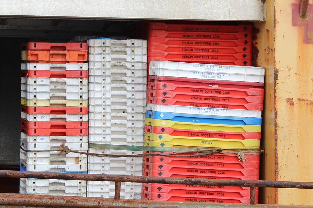 Im Hafen von Urk (Friesland, Niederlande) liegen neben den historischen Fischkuttern viele bunte Frachtkähne und Arbeitsboote mit Tauen und Anstrichen in den verschiedensten bunten Farben. Auf diesem stapelten sich bunte Kisten.