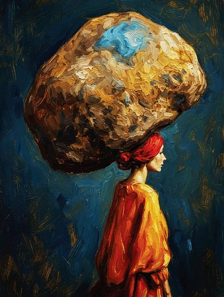 Dramatic impasto oil painting of a woman in flowing orange robes calmly supporting an enormous rock on her head, representing quiet strength and endurance. Rich textures and moody teal background create a powerful, introspective focal point for any contemporary space.