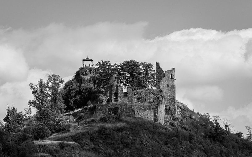 A black and white photograph of Burg Are / Burgruine Are in Altenahr.