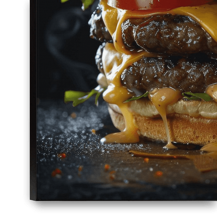 Experience the ultimate indulgence with this stunning image of a juicy double cheeseburger tantalising with melted cheese and fresh ingredients. The rising steam and appetising presentation make this poster a must-have for any kitchen or dining room. Ideal for burger lovers and foodies looking to add a touch of culinary art to their…