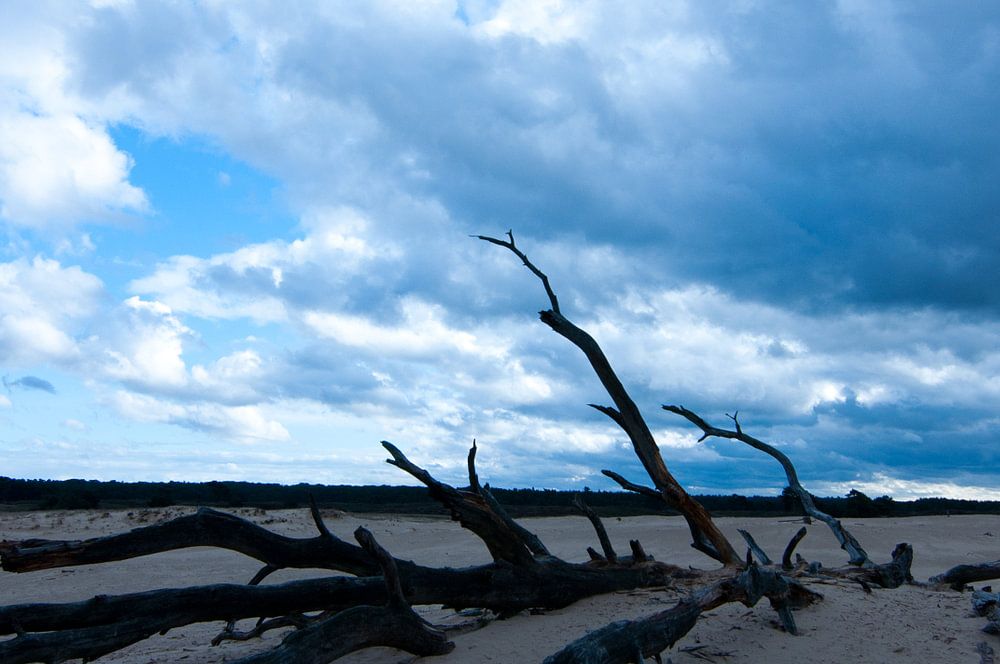 Buried tree on a sandy plain of the Hoge Veluwe National Park.