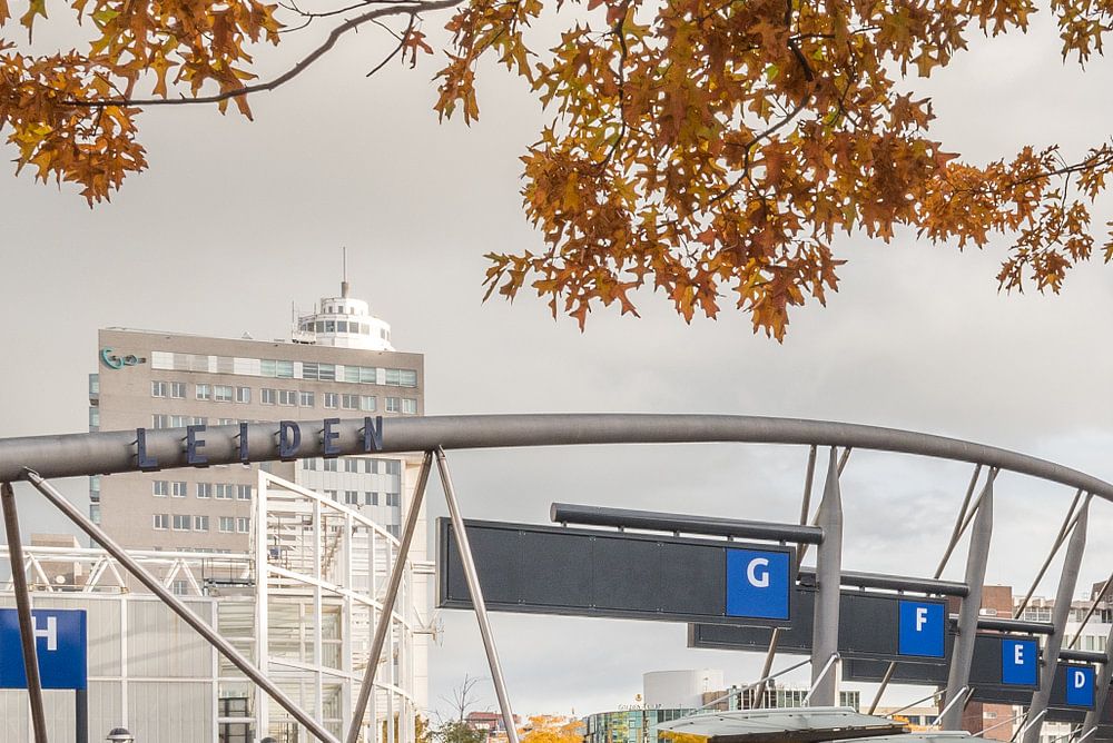 Mooie herfstkleurige bladeren kaderen het zicht op het busstation van Leiden Centraal.