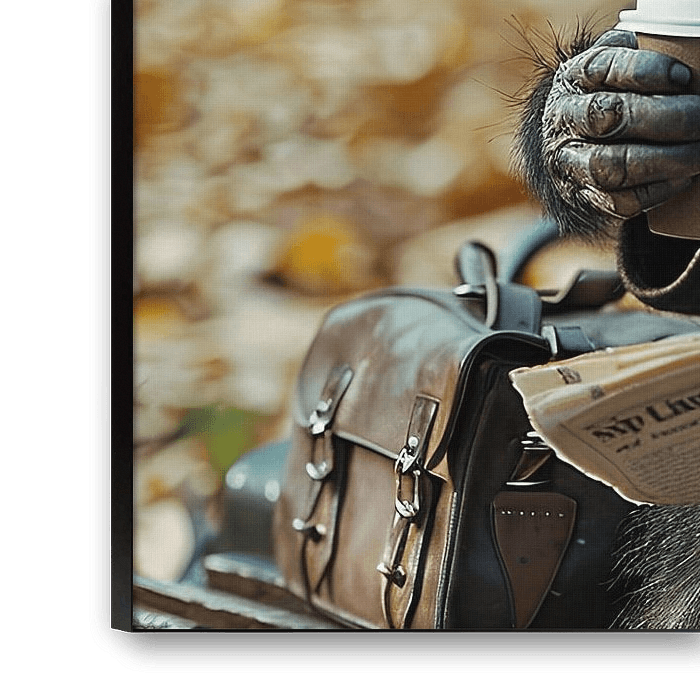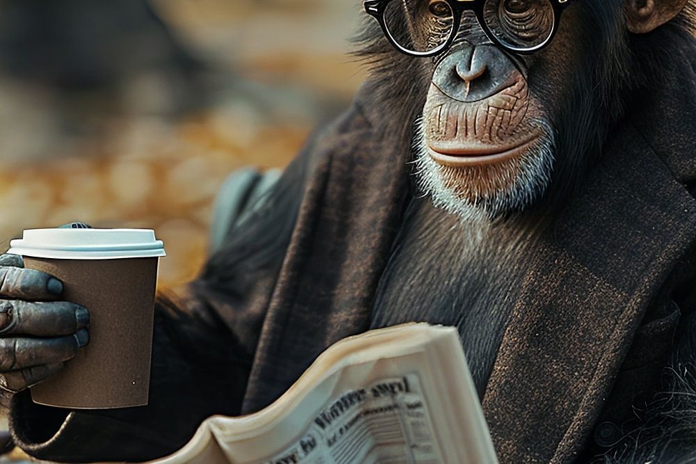 A monkey in business attire relaxes, reads a newspaper and holds a coffee mug in the autumn park.