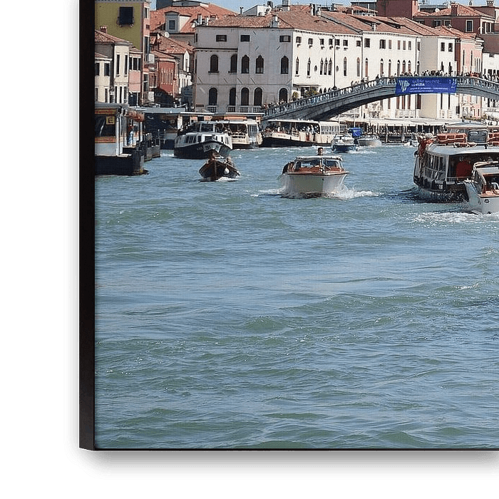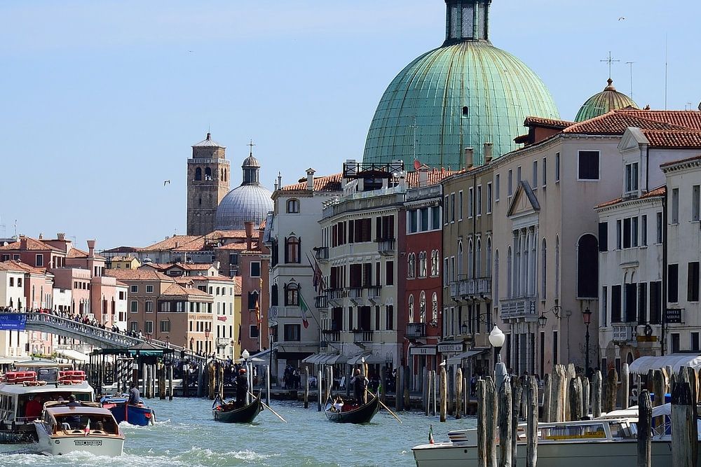 Busy traffic on the Grand Canal in the city of Venice, Italy. It forms one of the major water-traffic corridors in the city. One end of the canal leads into the lagoon near the Santa Lucia railway station and the other end leads into the basin at San Marco; in between, it makes a large reverse-S shape through the central districts (sestieri) of Venice.