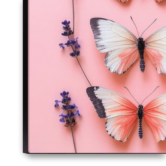 This lovely, trendy artwork shows a breathtaking collection of butterflies, artfully placed against a background that seamlessly transitions from soft pink to lilac.