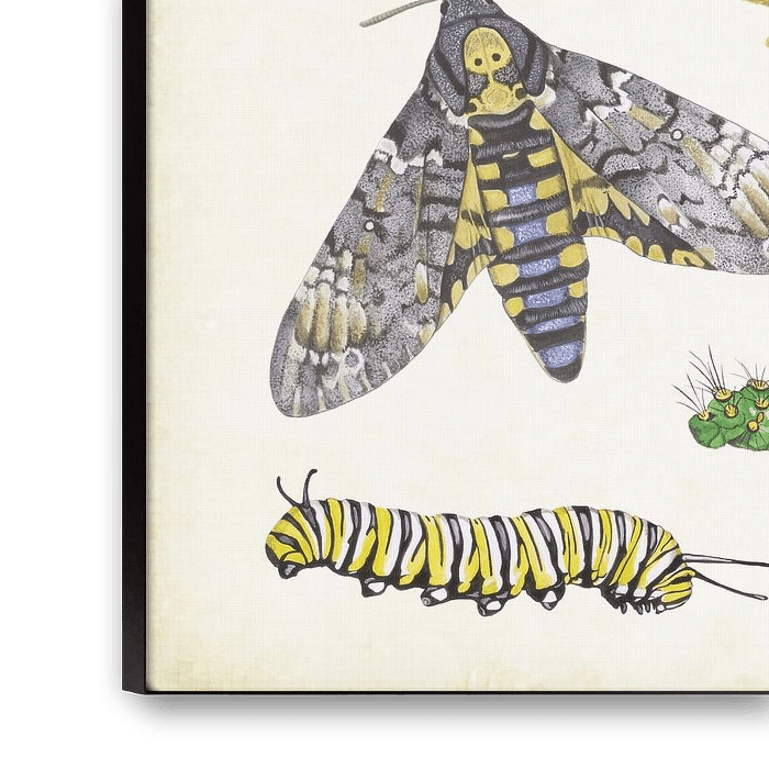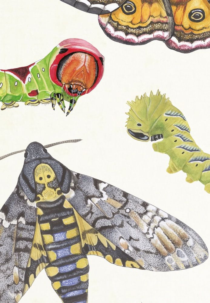 A collage of butterflies and caterpillars illustrated by nature illustrator Jasper de Ruiter. This plate shows the caterpillars of great cabbage white, ermine butterfly, skullcap butterfly, night peacock moth and monarch butterfly. The two butterflies are the night peacock and skull butterfly.