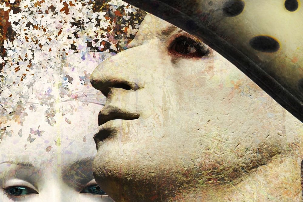 This impressive collage plays with surreal and psychological motifs to explore the fragile border between fantasy and reality. At the centre are two sculptural heads: the front one - a male torso with a fixed gaze and hollow, full of holes like a cheese under a hat - symbolises emptiness, perhaps also ignorance or overconfidence. The rear head - female, delicate and almost doll-like - is surrounded by a cloud of butterflies, which could represent thoughts, dreams or inner turmoil.