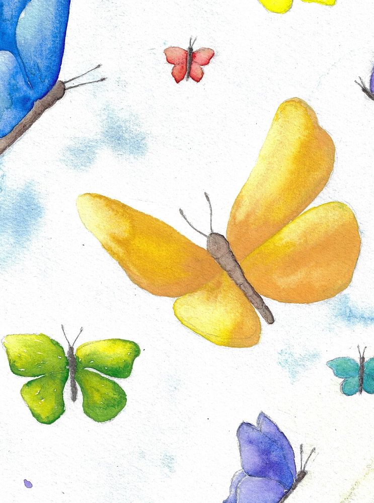 This watercolour painting shows the lightness of butterflies in beautiful colour gradients