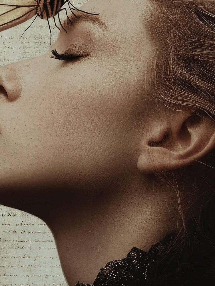This artwork exudes a soft, poetic mood where a butterfly has landed on a woman's face. The delicate colours and subtle textures create a sense of impermanence and mystery. The butterfly symbolises transformation and transience, while the interwoven fragments of letters and pages's from books echo bygone times and memories. The woman's expression is serene, almost dreamlike, giving the whole work a meditative and introspective dimension. The work invites the viewer to dwell on the beauty of the moment and the fleetingness of life.