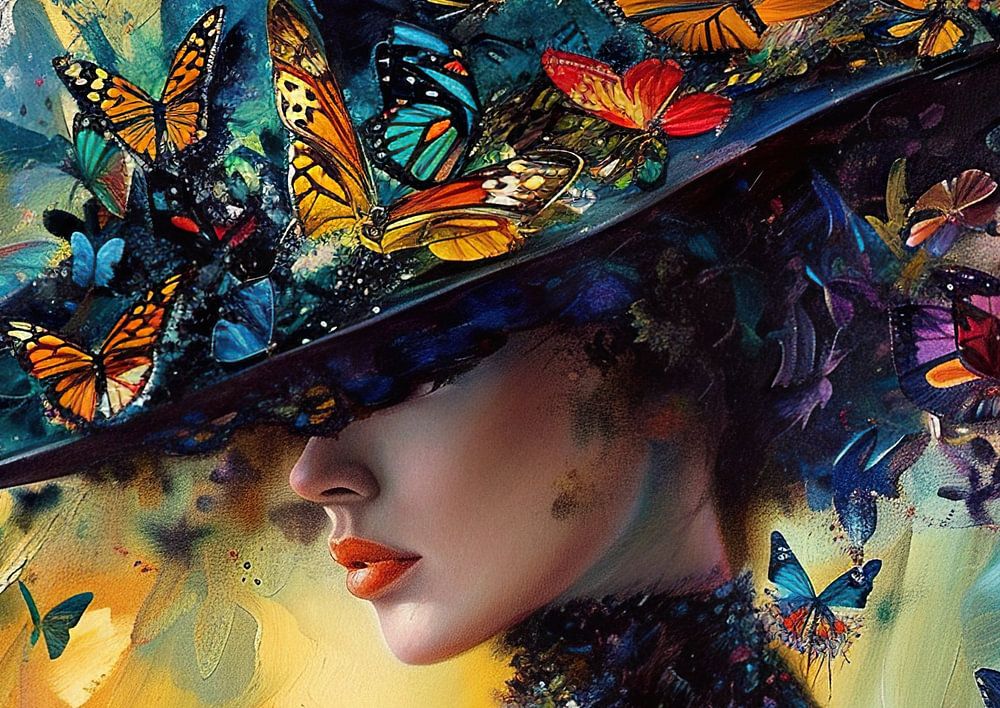 Butterfly Elegance - This women's painting shows an elegant lady enveloped in a rich colourful texture of numerous butterflies on her hat and clothing, surrounded by a vibrant and dynamic background that captures the essence of a dreamlike natural setting.
