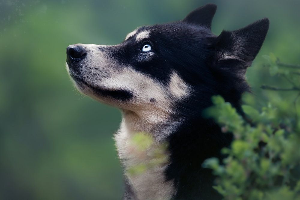 A beautiful husky with one blue eye and one brown eye sits in the forest. The dog is watching a butterfly flutter by. It has a dreamy atmosphere all together like this.
