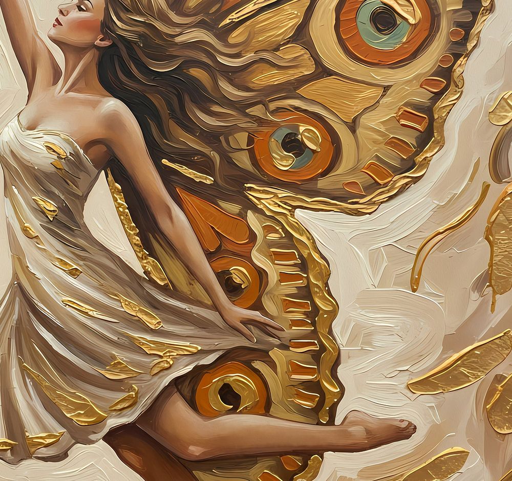 Fantasy art in gold colour. A butterfly fairy with golden wings flies to the sky. Artwork in oil painting style. Created with AI based on a hand-drawn charcoal drawing.