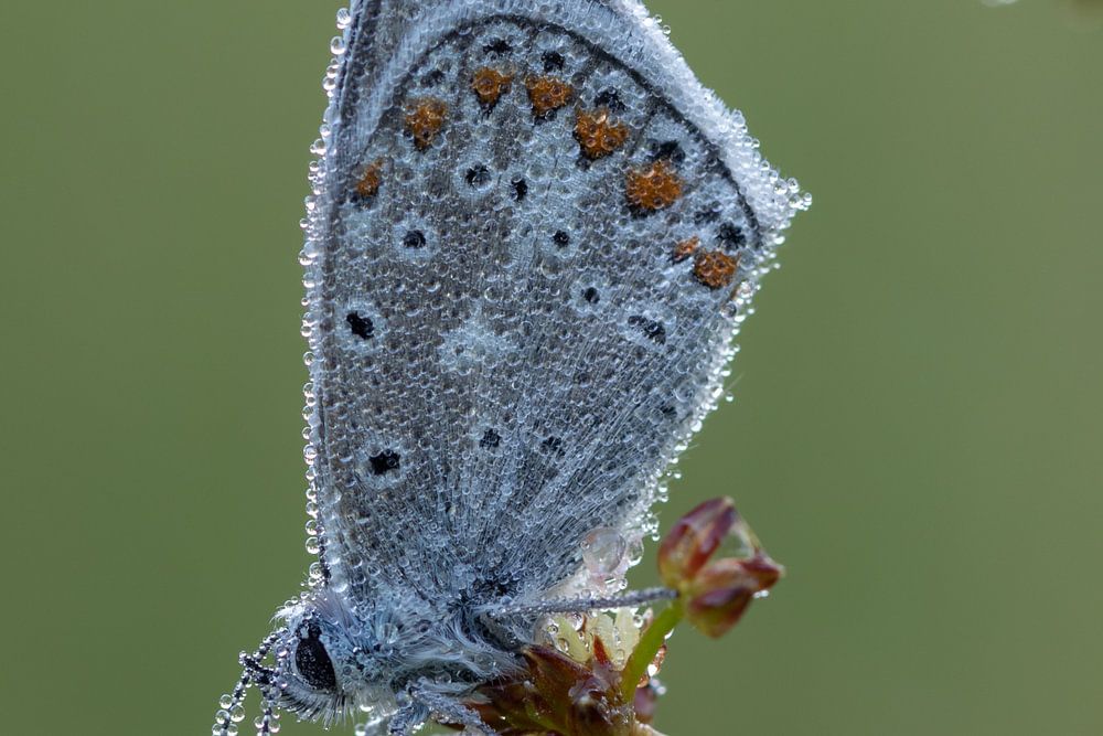 An icarus blue is full of dewdrops after a cold night. The butterfly hangs around waiting for it to dry so it can fly away.