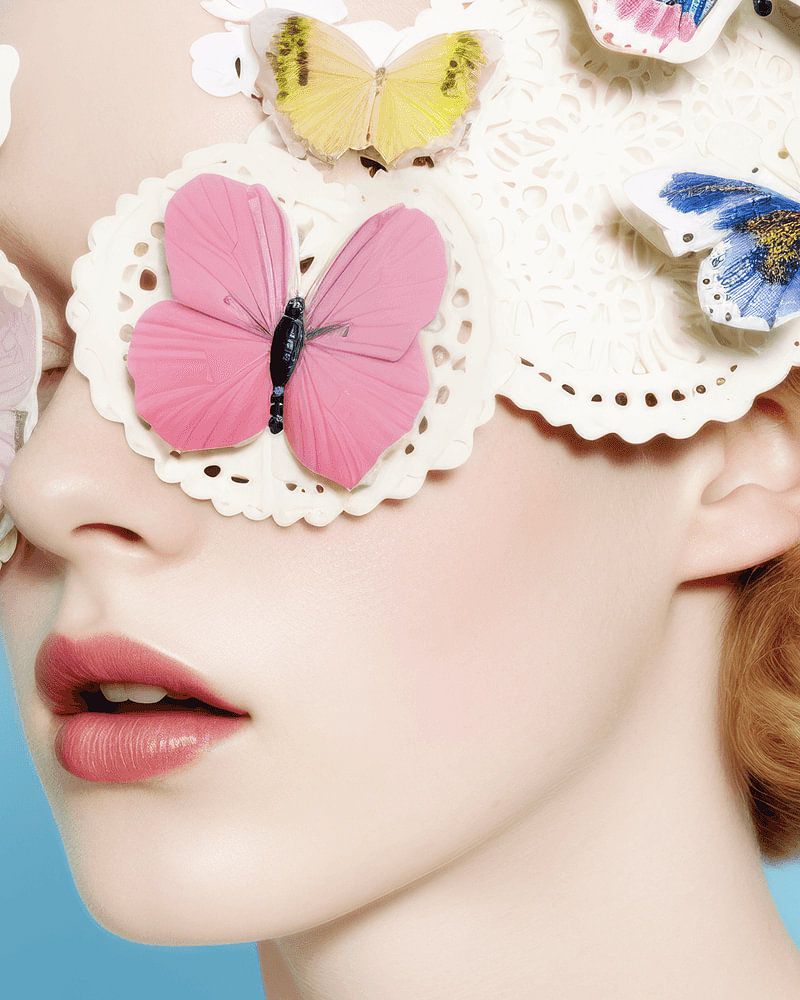 Butterfly girl in pastel colours. A modern portrait of a girl surrounded by paper butterflies. A humorous work with a wink, pastel colours.