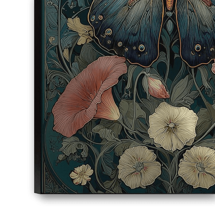An Art Nouveau-style illustration featuring a majestic blue butterfly, surrounded by soft pink and white flowers reminiscent of morning glories. The composition exudes elegance with its symmetrical structure, rich colors, and graceful lines. The butterfly's turquoise wings, dotted with eye-shaped patterns, contrast beautifully with the warm floral tones against a deep green background.