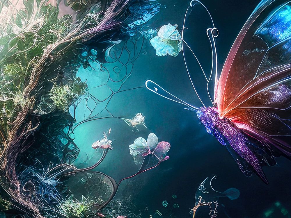 A partially transparent butterfly in bright blue red and purple hues flying in a wondrous forest full of fantastic plants and flowers. The flowers seem to come from another world, with bright colours and bizarre shapes that capture the imagination.