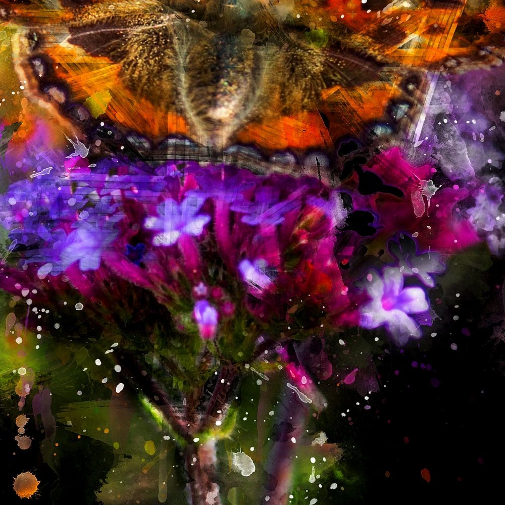 Colourful digital painting of an atalanta butterfly on a flower. Because of the dark background I used, the different colours come to the fore and stand out from the canvas.