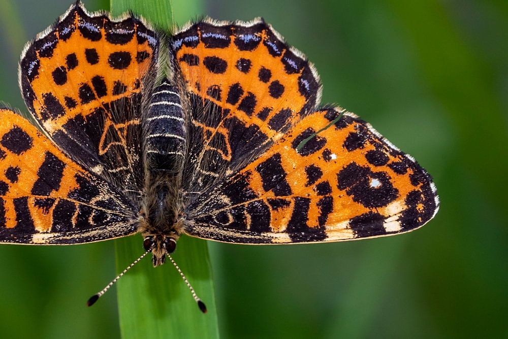 A butterfly rests for a moment on a grass stem.