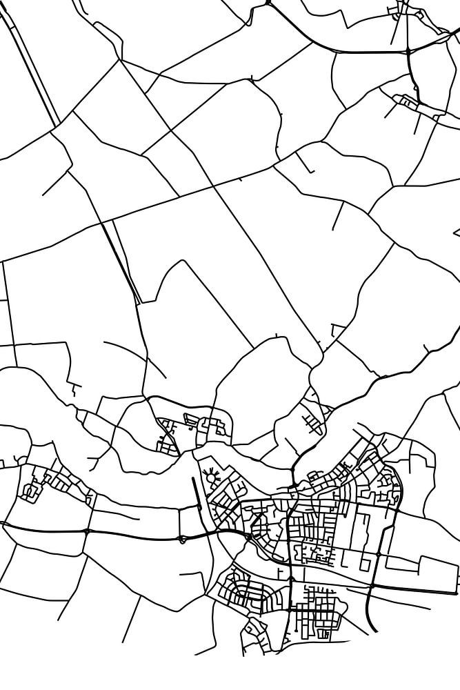 Black and white map, street map or street plan of Buurmalsen. Buurmalsen is located in the Betuwe, in the municipality West Betuwe, province Gelderland. On the city map all public roads in Buurmalsen are included. Furthermore, the map is provided with the coordinates of the center of Buurmalsen.