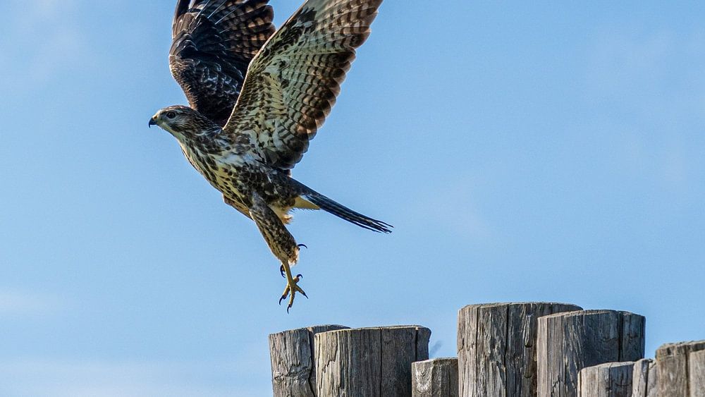 I photographed this buzzard on Ameland. I was just in time to grab my camera. He was sitting on the pole at the time. Actually, the photo is a lucky shot because he just flew away, making it so beautiful in composition. You can see it taking off.