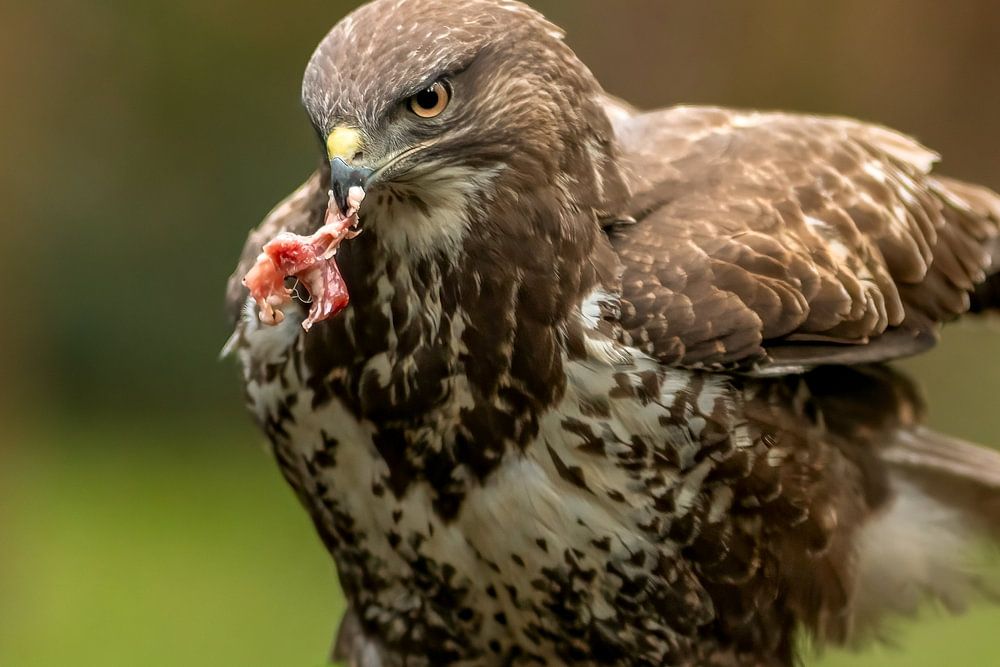 The buzzard holding prey in its beak. A beautiful portrait showing nature as it really is. Photographed in a forest while the buzzard is on the ground eating its prey. Sharp deteails can be seen in the eyes of the bird of prey.