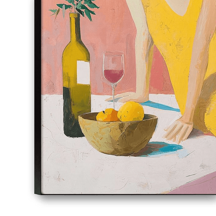 A stylish, minimalist painting captures a soothing Mediterranean scene. A woman in a striking yellow dress sits contemplatively at a table with a bottle of wine, a glass, and a bowl of citrus fruits against a two-tone background where a graceful palm tree stands out against a turquoise sky.
