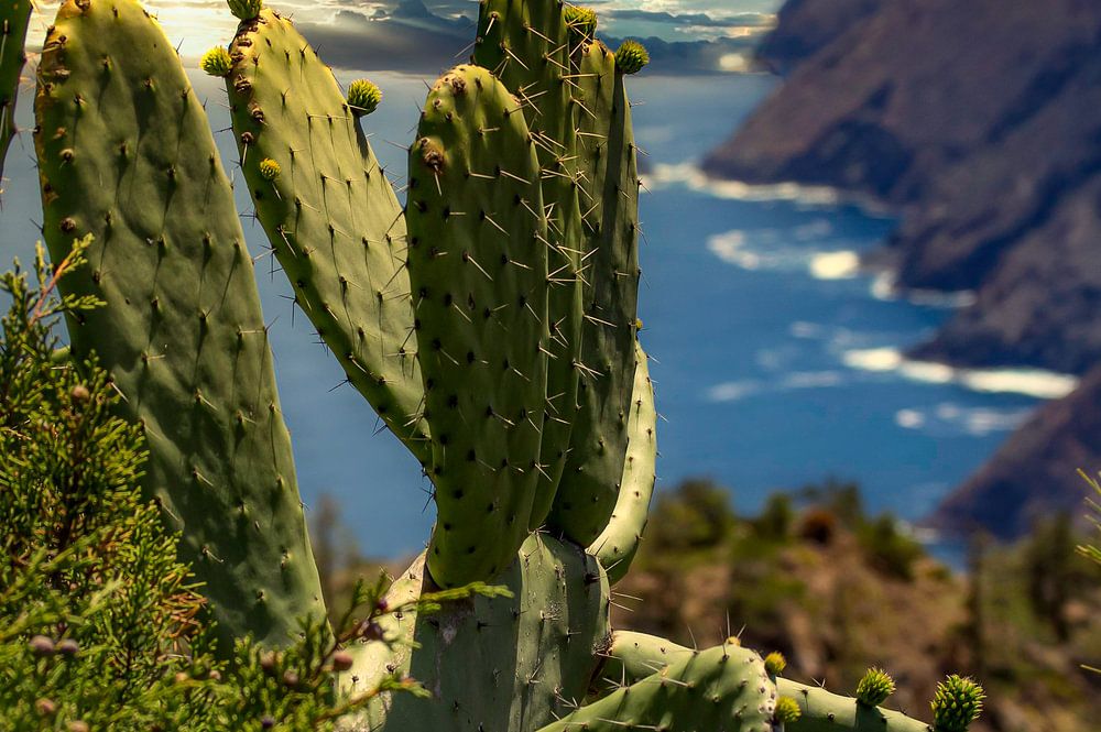 In the foreground of the picture several cacti above the cliffs of the Spanish island La Gomera can be seen as an eye-catcher. In the background you can see the blue sea and the beginning sunset.
