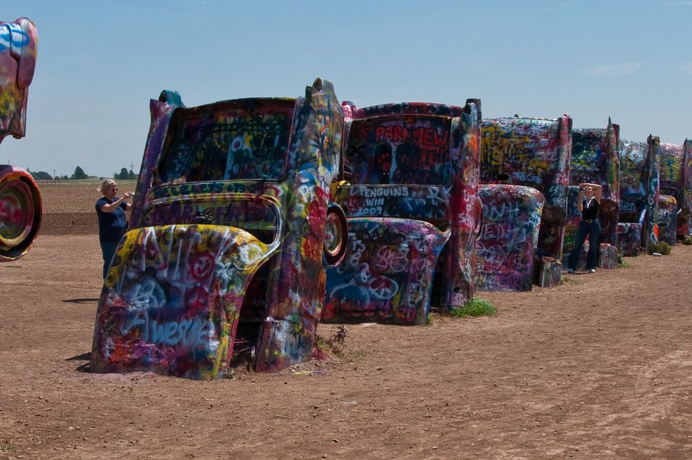 The image shows a well-known art installation called Cadillac Ranch, located in Amarillo, Texas. The installation consists of a series of old Cadillac cars half buried with their noses in the ground. Each car is covered with layers of colourful graffiti and paint, creating a vibrant and eclectic display. The cars are arranged in a straight line and the installation is in an open, barren field under a clear blue sky. This location is interesting and relevant because it is a well-known tourist attraction and a symbol of American pop culture and artistic expression.