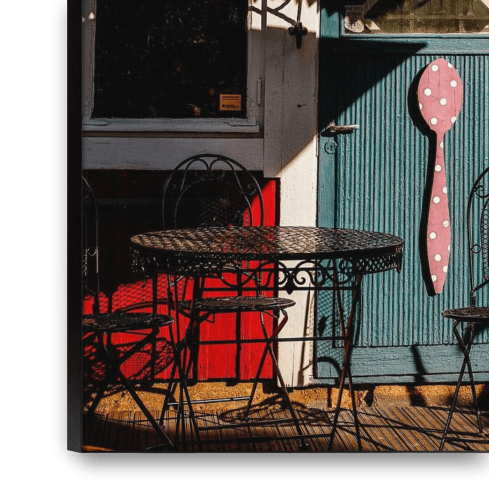 Sunlit café vibes: a teal-blue door with a playful pink polka-dot spoon set into a deep red wooden facade. Wrought-iron chairs and a patio umbrella cast crisp, graphic shadows. Warm, welcoming and full of…