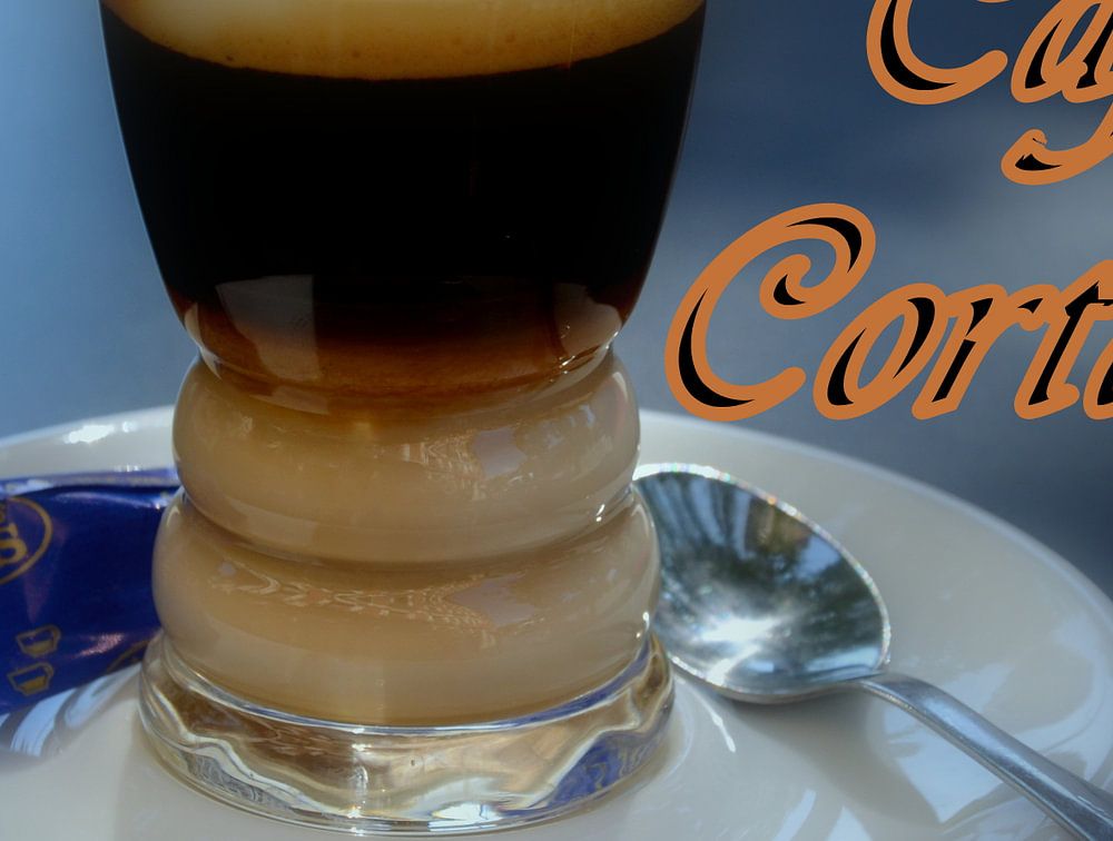 Cafe cortado, Spanish espresso with milk and foam in a glass. With inscription.