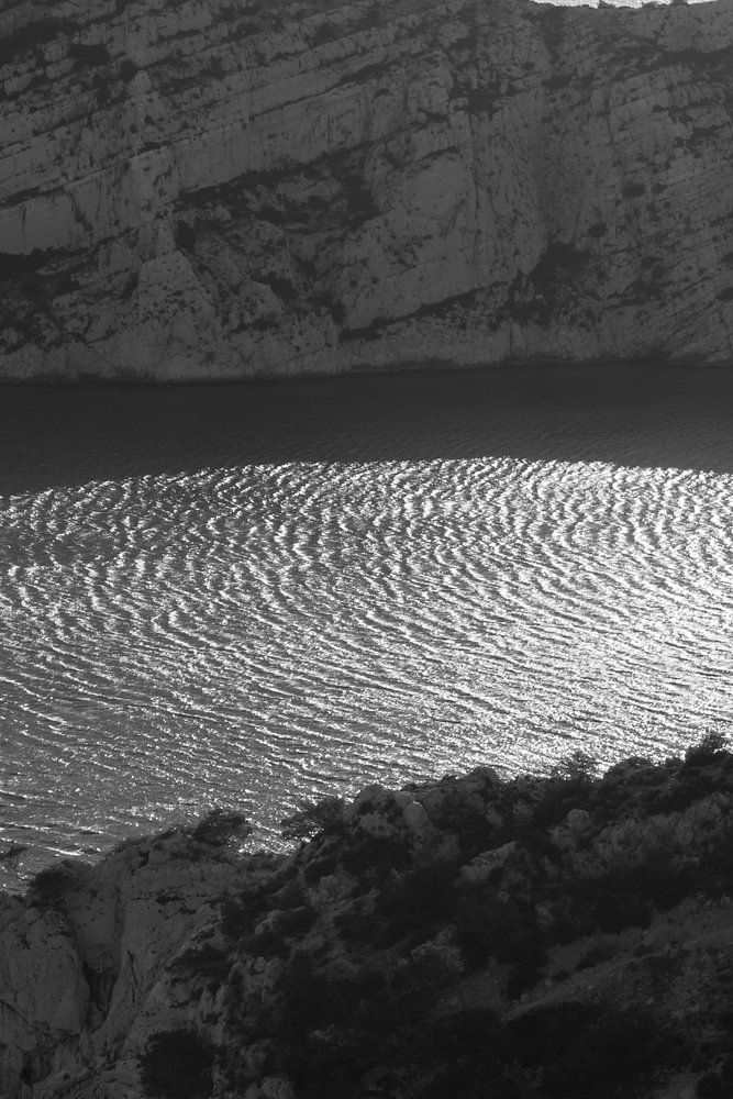 Calanques on the sea, Marseille, France. Black and white, vertical.