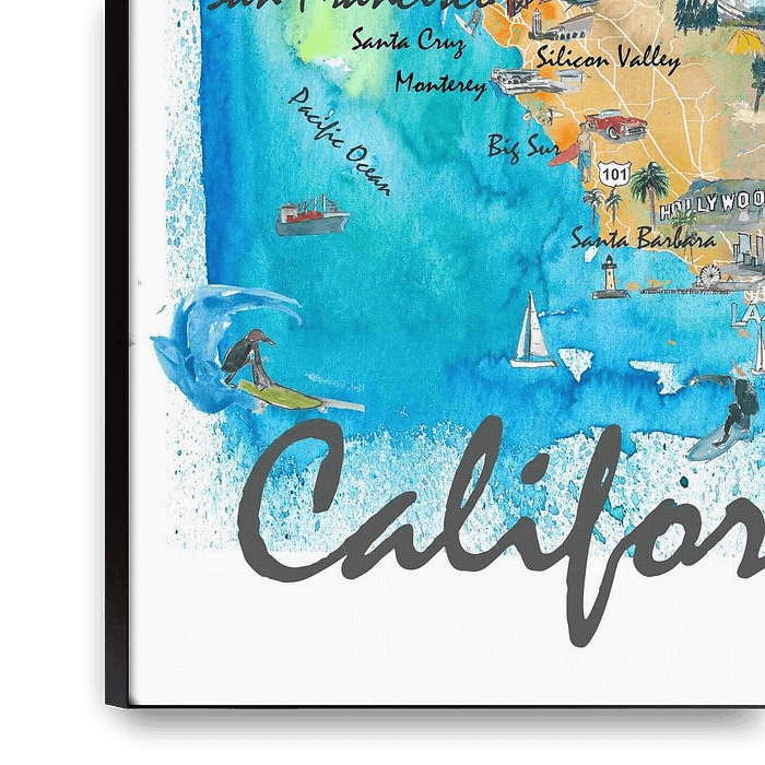 Buy this painting California illustrated map with tourist highlights and roads 2. by Markus Bleichner as a reproduction on canvas, ArtFrame, poster and wallpaper, printed on demand in high quality.