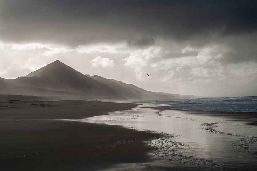 The beautiful deserted beach 'Playa de Cofete' in the south of the Canary Island of Fuerteventura. A stormy sky hangs ominously over the mountains and the sea. It almost looks like a black and white photograph, but this is a colour photograph, which got these tones due to the backlight and the dark weather.