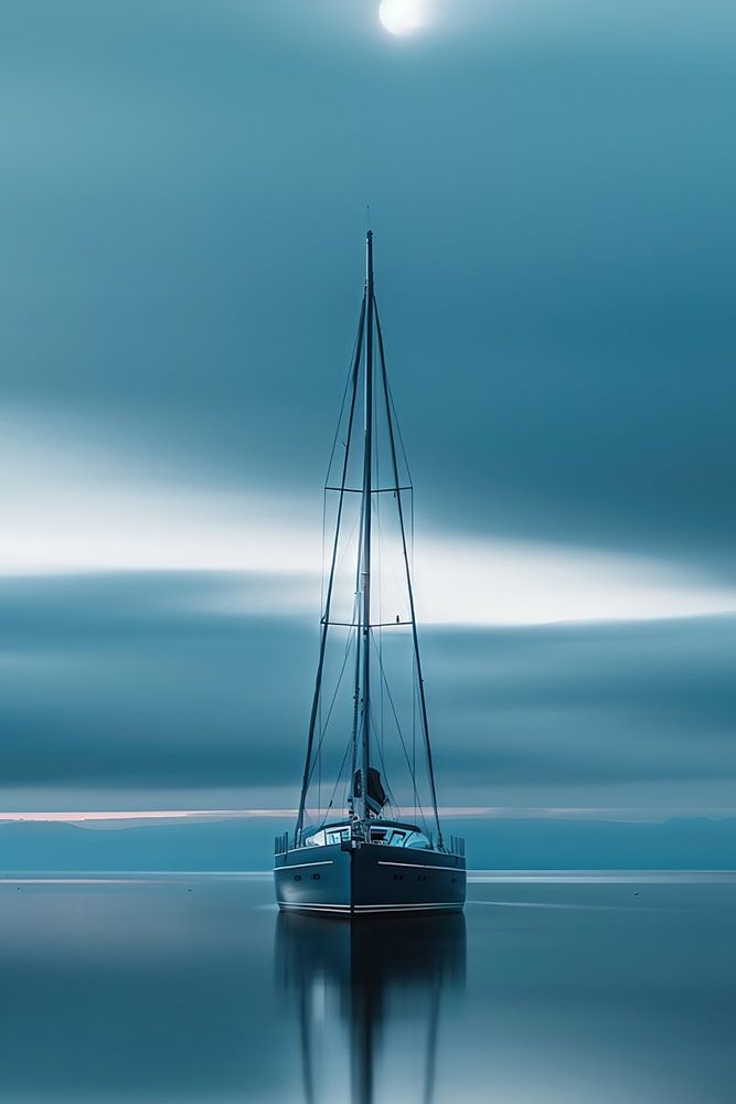 Buy this landscape artwork Calm sea, boat drifting by fernlichtsicht on canvas, ArtFrame, poster and wallpaper, printed on demand in high quality.