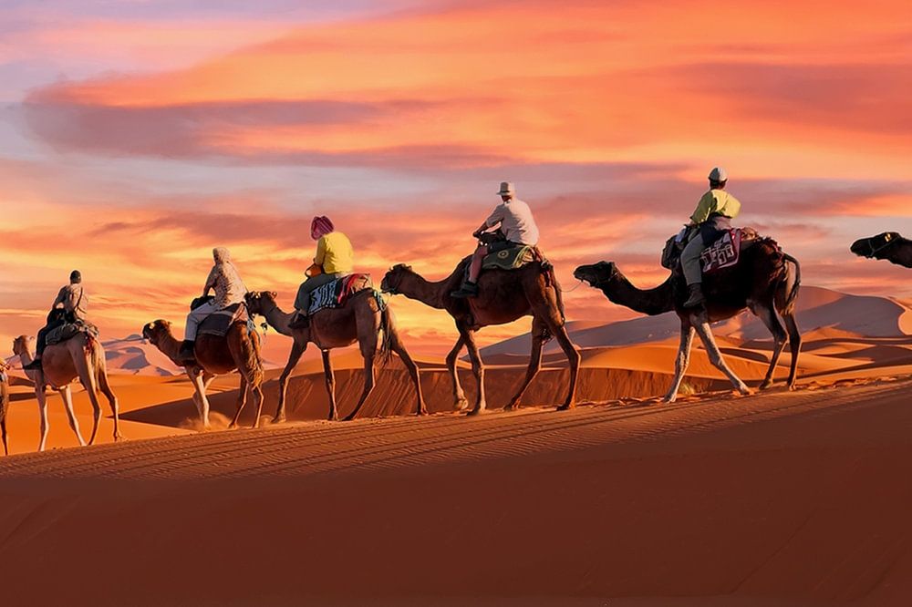 Camel caravan through the Sahara desert with sunset in Morocco