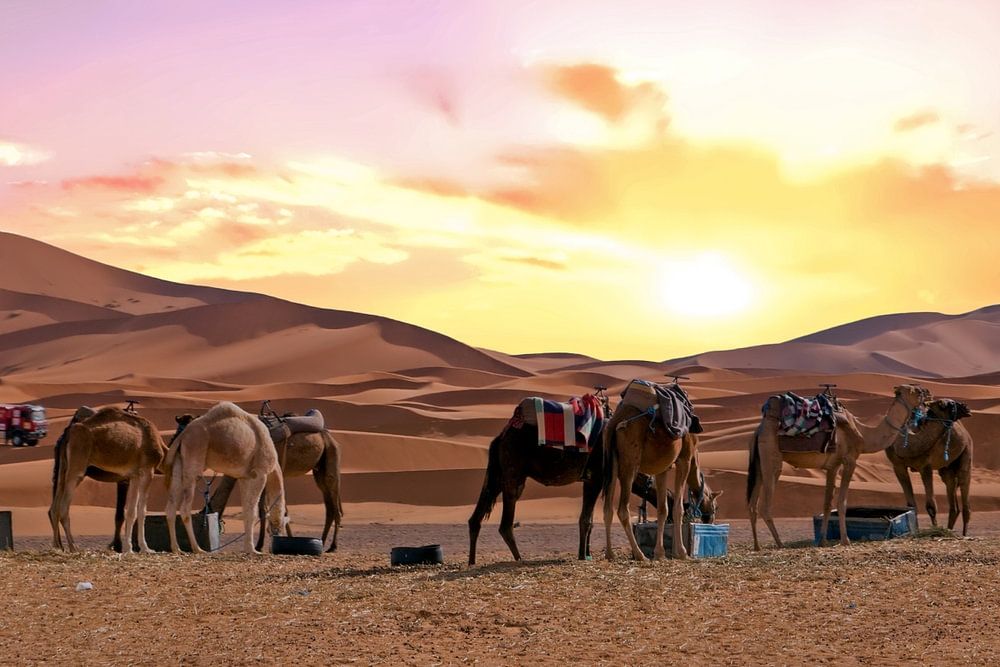 Camels in the Sahara desert of Morocco at sunset