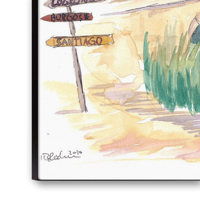 Buy this painting Camino de Santiago Puente de La Reina with signposting by Markus Bleichner as a reproduction on canvas, ArtFrame, poster and wallpaper, printed on demand in high quality.
